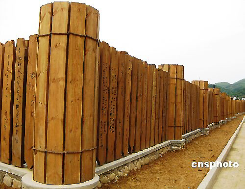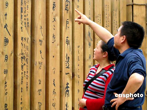 5月30日,游客在湖南省湘西土家族苗族自治州龙山县里耶镇欣赏“秦简墙”。当日,全长558米、由4280块里耶秦简仿制品构成的秦简墙建成。里耶秦简墙起于里耶防洪大堤和里耶河街,状如展开的书卷,是里耶古城遗址本体保护工程的一部分。 中新社发 唐荣沛 摄
