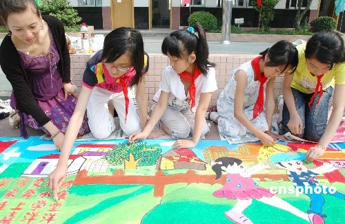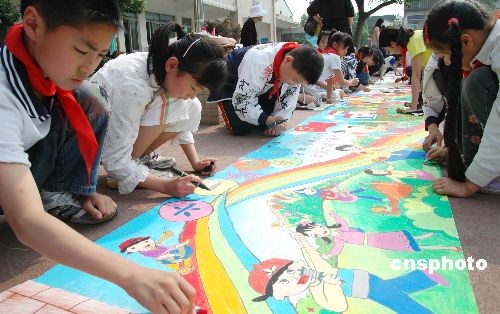 5月31日,经过选拔来自苏州市平江区东中市、敬文等12所实验学校的数十名少年儿童代表在苏州敬文实验小学举行了以爱国主义为主题的“绘百米长卷”现场绘画活动,喜迎“六一”儿童节到来。中新社发 苏民 摄