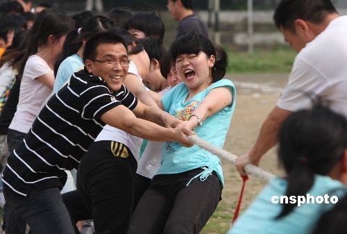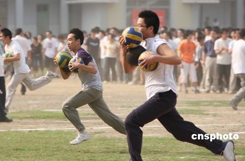2009年6月2日,湖北省襄樊五中高三年级的同学正在进行趣味体育比赛。高考进入倒计时,该校举办趣味运动会,为考生“降压”,进行心情调试,让学生以健康良好的心态迎接高考。中新社发 文铭 摄