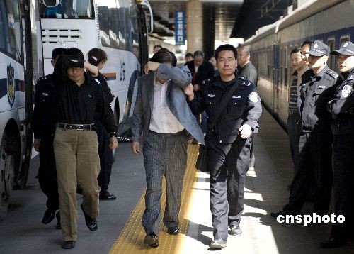 广西南宁一名人称传销业“教授”的何姓老汉,因组织在南宁市从事传销的140多名外省籍传销人员到北京参加所谓的“第二届群英会暨振兴民族经济杰出华人高峰论坛”,被南宁警方抓获。日前,“何教授”等4名主要犯罪嫌疑人已被南宁市青秀区人民检察院以组织、领导非法传销罪批准逮捕。图为南宁市经济犯罪侦查支队民警将“何教授”等人从京押解回南宁。中新社发 韦强 摄