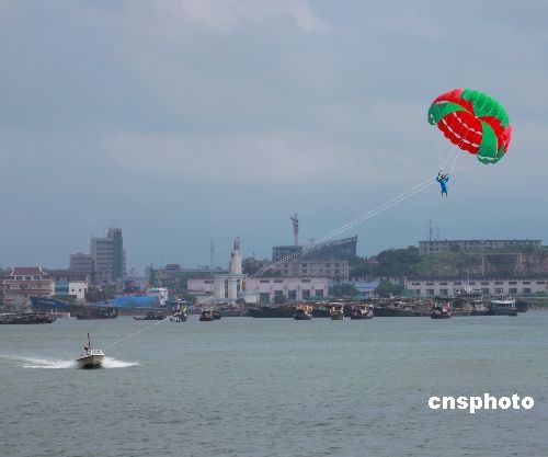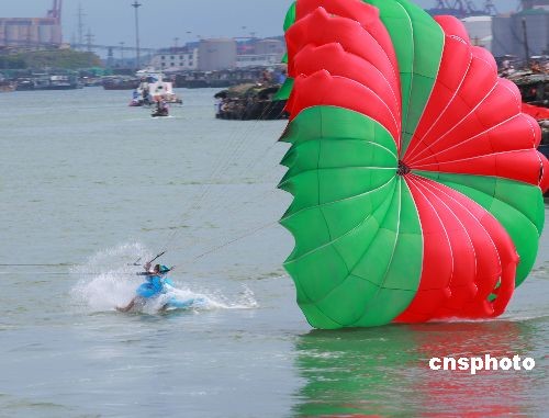 2009年6月6日,在广西防城港市举办的海上国际龙舟节上,穿插进行的海上滑水、滑翔伞表演发生一起惊险“小插曲”,由于风力过大,一架滑翔伞从高空跌入海中,令人欣慰的是运动员没有受伤。中新社发 梁富盈 摄