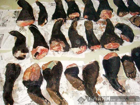 6月7日,广西警方破获一起特大走私案。一犯罪团伙以运废纸的名义,将173只熊掌及其他走私物品运至防城港市时,被警方抓获。