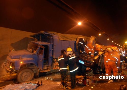 6月7日晚18时15分,渝武高速北碚至重庆路段北碚隧道内发生一起恶性交通事故,一辆江淮商务车与一辆大货车发生追尾,造成江淮商务车内11名乘客6人轻伤、3人被困、2人当场死亡,并造成渝武高速往重庆方向堵车近3个小时。中新社发 周然 摄