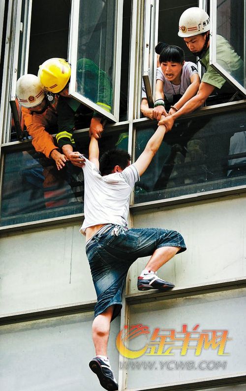 昨天中午12时许,天河区陶育路上演了惊险戏码:一男子爬出路边一临街商铺3楼窗外,意欲轻生。其后其妻子赶到,带泪哀求,也无法将其劝下。与救援人员对峙一个半小时后,在其体力不支险些滑落的一刹那,众人齐齐出手将其拽住,避免了悲剧的发生。