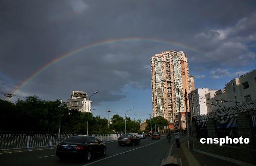 6月9日傍晚,北京东南上空出现了难得一见的彩虹,由于昨夜的大雨是入夏以来的强降雨,经过风雨的洗礼,北京的天气十分凉爽,空气清新,更在傍晚时出现彩虹。中新社发 王保胜 摄
