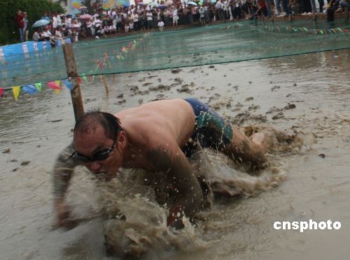 6月9日上午,浙东渔村——象山县第二届海涂节暨全县海涂趣味运动会在新桥镇举行,吸引了来自县内外各地的近万名游客参加。图为泥浴场里的一位形似美国菲尔普斯的参赛者。中新社发 何蒋勇 摄