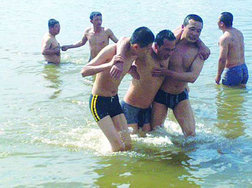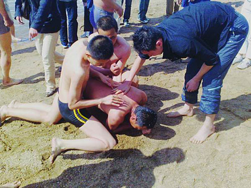 上岸之后,人们手忙脚乱地要学电视里的样子给昏迷过去的韩德强挤压心肺,小伙子再一次表现出来非凡的冷静:“不能让他仰卧!否则鼻腔里的水可能进入脑部。”小伙子半跪在岸边把韩德强俯卧着放在自己腿上,拍打他的后背将水控了出来,丝毫没在意自己的膝盖已经被尖锐的沙石擦伤,流出了鲜血。