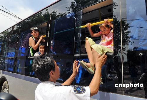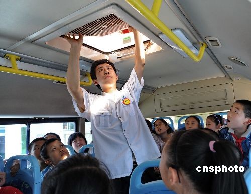 6月11日,济南趵突泉小学,来自济南公交恒生四队的驾驶员们给孩子们讲解遭遇公交车火灾、事故等突发事件逃生技巧:紧急开门、天窗逃生、救生锤打玻璃跳窗逃生等。孩子们学得非常认真,还亲身体验了逃生的方法。 中新社发 罗波 摄