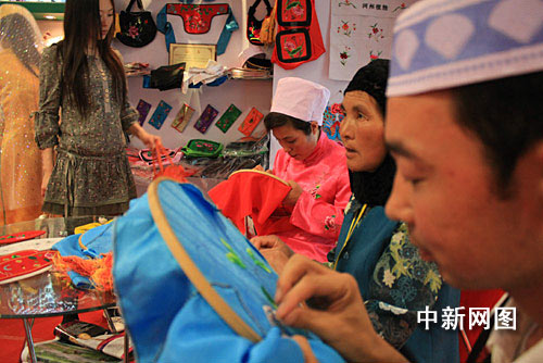 第四届甘肃省文化产业博览交易会6月12日至15日举行,临夏民族刺绣在此间展出,这是中国四大名绣之外的又一民间刺绣工艺,由临夏回族群众创造,色彩艳丽,花纹和文字极具象征性。同时,其图案吸收了中亚伊斯兰风格。据介绍,这种刺绣不仅远销阿拉伯国家,还在法国、英国颇受青睐。殷春永 摄