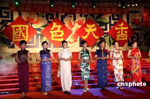 6月13日晚,为期三天的北京朝阳区“文化遗产日”专题活动,在朝阳区望京文化广场拉开序幕。百人旗袍表演向社区居民展示了“国色天香”。中新社发 张爱东 摄