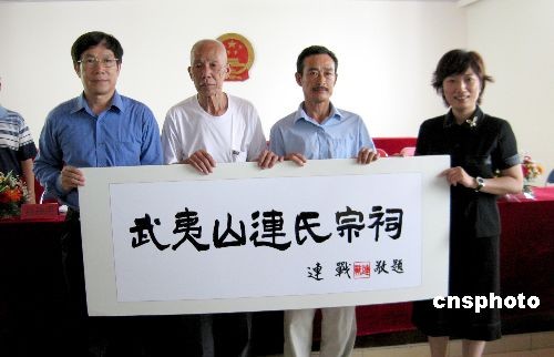 6月15日上午,中国国民党名誉主席连战为福建武夷山连氏宗祠题匾交接仪式在福建武夷山举行。福建省姓氏源流研究会连氏委员会会长连文成(左一),向福建武夷山连氏宗亲(中)赠送匾额。中新社发 唐建生 摄