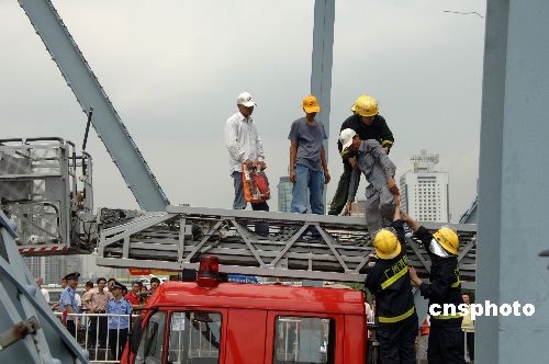 6月17日上午7时许,4个来自广东阳江报平村的农民因土地问题爬上广州海珠桥,给南来北往的市民造成了很大的影响。图为10时40分,4位跳桥者在警方人员的劝导下全部平安落地。中新社发 梁永强 摄