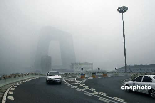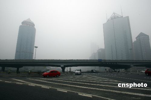 6月18日中午,大雾笼罩京城,CBD国贸桥附近能见度有限。据悉,北京雷雨“相约”黄昏后,从今起连续三天,北京将阴雨连绵。雷雨天气除了带来凉爽外,将给市民出行带来些许不便。中新社发 郑雄增 摄