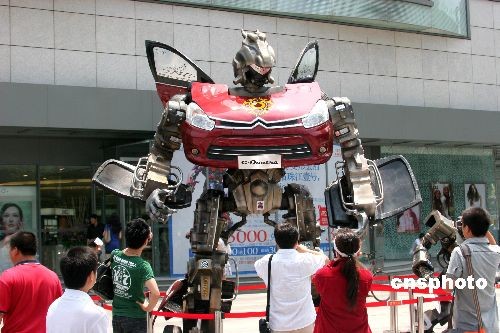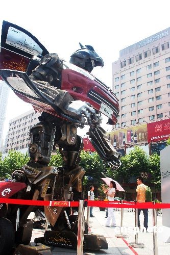 2009年6月19日,江苏南京珠江路一商家门前矗立起一只高达4米多的巨型“汽车人”,引起了南京市民的注目。中新社发 郑晨烜 摄