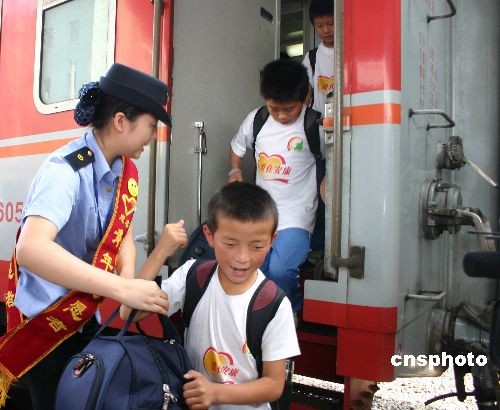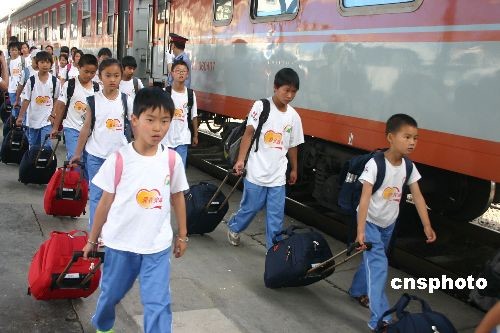 6月20日16时25分,由铁道部特批的“日照-成都”爱心专列安全驶入成都南站。522名在山东日照“安康家园”学习生活的地震灾区孩子,在离开四川家乡一年后,重新踏上家乡的土地,即将开启他们新的生活。去年6月,在全国妇联、中国儿童少年基金会的安排下,来自四川省10个市、州的共720名灾区娃娃,分22批陆续安排到山东日照市生活、学习。其中有522四川地震灾区的娃娃(其中338名地震孤儿)前往山东日照市“安康家园”学习生活,日照钢铁集团拿出192套新建职工住房建起“日照安康家园”,配备了120多位专职“安康妈妈”,同时建起食堂、医务室、电子阅览室等,创造了全国灾区娃娃安置中最大的“家”。中新社发 霍潺 摄