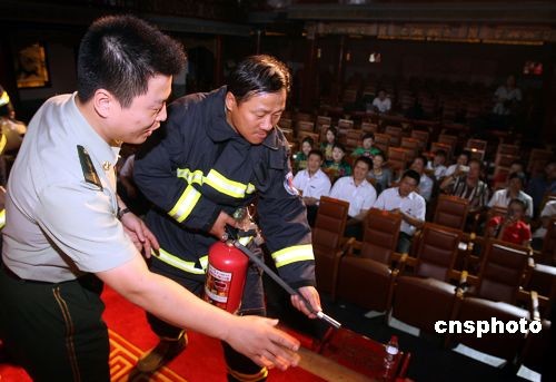 近日,北京崇文警方来到辖区内的刘老根大舞台,与40多名演职人员进行一场别开生面的消防演练。中新社发 胡建强 摄