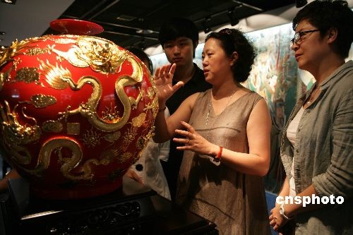6月23日,北京漆宝斋锦丽漆艺中心在奥体中心建成并开展,许多国宝级漆艺首次与观众见面。图为中心主创人沈锦丽女士给观众介绍中国红漆线雕“九龙呈祥”,据介绍,当年中国篮协送给姚明的神秘婚庆礼品正是这款“九龙呈祥”。中新社发 赵隽 摄