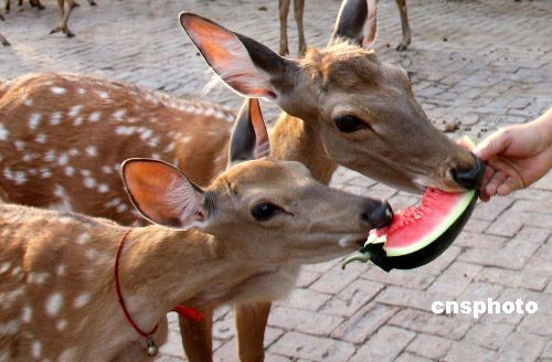 6月23日,山东聊城最高气温37℃,动物园饲养员采取喷洒凉水、水果喂养等办法为动物降温。中新社发 孔政 摄