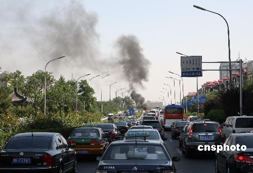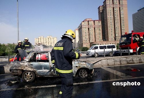 6月24日15时30分许,一辆汽车在北京西二环的白纸坊桥附近发生自燃,交通堵塞近半个小时,消防车赶到把火扑灭后交通才恢复正常,但是汽车已经面目全非。北京连日来出现高温天气,24日最高气温达到37度。中新社发 松涛 摄