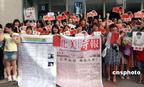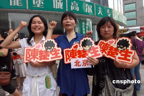 6月25日, 歌手陈楚生全国各地的歌迷“花生”齐聚湖南长沙仲裁委员会声援陈楚生解约案第四次开庭。当日,歌手陈楚生和天娱公司解约案在湖南长沙仲裁委员会进行第四次开庭,引起社会各界关注。中新社发 郭国权 摄