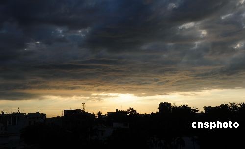 6月26日早晨5时,2009年第4号热带风暴“浪卡”(NANGKA)的中心位于东沙岛偏南方大约220公里的南海东北部海面上,中心附近最大风力有8级(20米/秒)。预计,风暴中心将以每小时15-20公里的速度向西北方向移动,将于6月26日夜间到27日上午在广东惠来到珠海一带沿海登陆,登陆后强度迅速减弱。中新社发 蒙钟德 摄