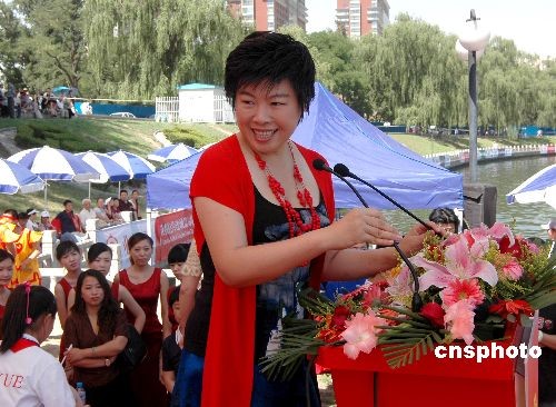 6月28日,北京师范大学艺术与传媒学院副院长于丹身穿漂亮的红色披肩,戴着红色项链出席了在北京昆玉河八一湖畔举办的“中华龙舟大赛”决赛现场,并在决赛前,为现场观众作了“关于中国龙文化”讲演。中新社发 李文明 摄