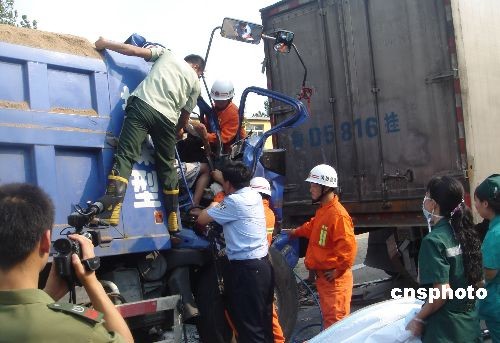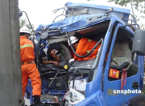 6月30日15时34分,山东省滕州市北辛街道于岗加油站处发生一起两辆大货车追尾事故,一名司机被困于变形驾驶室中,在滕州消防中队的紧急救援下,该司机被及时救出,受伤司机目前仍在救治中。中新社发 季龙 摄