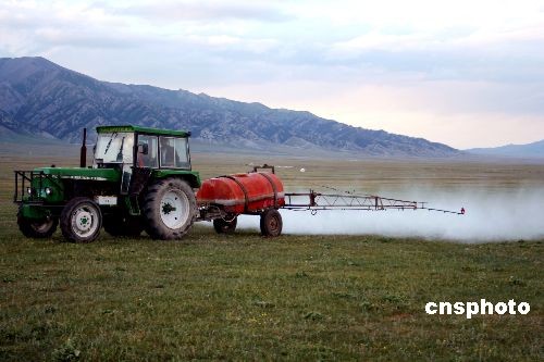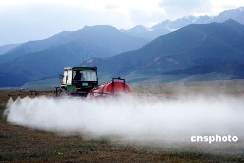 近日,新疆生产建设兵团农五师八十六中心团畜牧公司工人利用机车喷施药物,采用生物方法灭草原蝗虫。据悉,受气候因素影响,新疆生产建设兵团农五师海西草场蝗虫繁殖迅速,从今年6月初开始,该草场每平方米草场上积聚了150只到200只不等的蝗虫。面临蝗虫灾害,农五师迅速采用了不污染环境,对人畜安全,且简便、经济有效的生物药剂进行灭虫,有效地防止了草原虫害。中新社发 杜伟 摄