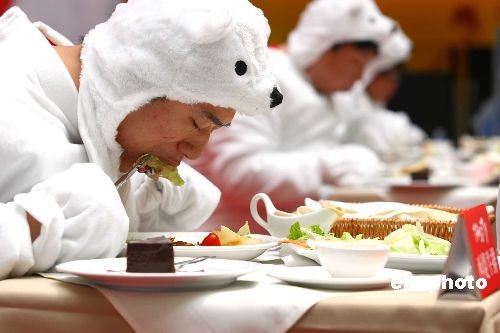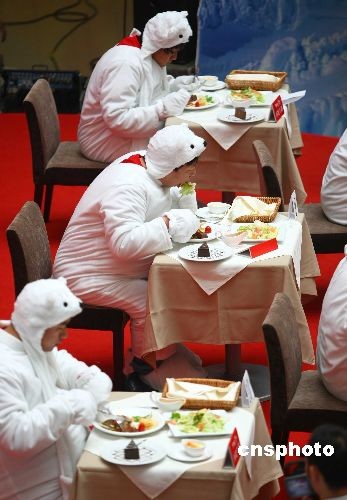 7月4日,一项关注全球变暖的时尚环保比赛在北京一购物中心举行,比赛者身披厚厚的毛皮、头戴北极熊头套,在千瓦钨丝灯光的烤射下,比赛吃西式牛排套餐。活动旨在倡导都市潮人们在享受时尚浪漫生活的同时,不忘“环保、减碳、爱地球”,关注“地球均温如升高6度,冰川融化,不只北极熊将失去家园,地球也将面临毁灭”的现实话题。中新社发 富田 摄