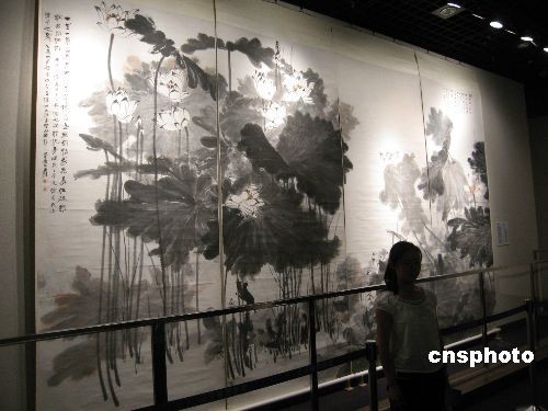 7月3日至8月3日,由辽宁省博物馆、台北历史博物馆、中华海峡两岸文化资产交流促进会共同主办的《南张北溥——台北历史博物馆藏张大千、溥心畬书画作品展》,在辽宁省博物馆举办。展品中张大千的《大墨荷通屏》画长6米、高3.58米,可称得上是巨作,很多参观者被其所吸引。图为7月7日,人们纷纷在画作前拍照留念。中新社发 沈殿成 摄