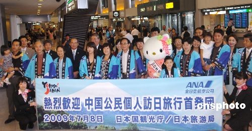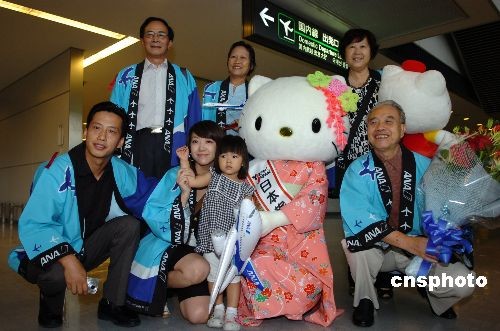 当地时间7月8日,日本开放中国个人旅游签证后的首批自助游游客乘机抵达成田机场,受到日方的热烈欢迎。中新社发 朱沿华 摄