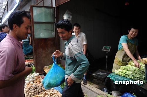 图:乌鲁木齐市民在农贸市场购买食品