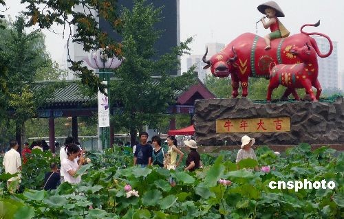 7月10日,正在北京莲花池公园举行的荷花节市民游客参观,古莲池中展示辽宁普兰店古莲、保定古莲、北孙各庄古莲、中南海古莲。环湖区域及4个广场有7000余盆盆栽荷花,推出的荷花名莲展,包括荷花新品种“粉凌云”,以及荷花珍稀品种“千瓣莲”、“友谊牡丹莲”等七种名莲。中新社发 钱兴强 摄