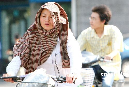 7月11日,古城苏州最高气温达到35.8摄氏度,许多出行的市民纷纷以各自方式遮挡烈日。 中新社发 王建中 摄