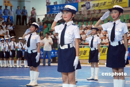 7月13日,“少年交警”在2009重庆市少年交警大会操活动上表演交警手势信号操。少年交警大会操活动旨在通过比赛充分展示“少年交警”的风采,让中小学生学习交通安全法律法规知识和安全出行常识,保障中小学生出行安全。中新社发 谢捷 摄