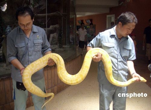 7月14日,一条3米多长的宠物大蟒蛇爬近邻家正在装修的浴室,事件惊动了民警和上海动物园工作人员,最后由后者将蟒蛇抓走。据悉,这条蟒蛇属国家一级保护动物,其主人为同楼的林姓老板。目前在上海,饲养、交易另类宠物的行为正悄然流行,但属于违法行为。中新社发 宣克炅 摄