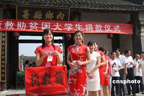 7月14日,在国家重点文物保护单位河南内乡县衙,工作人员在为贫困大学生捐款。该县在7月5日启动“奉献爱心圆大学梦”工程,社会各界已经为贫困大学生捐款近10万元。中新社发 张中立 摄