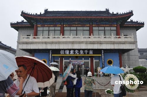7月17日上午,任继愈先生遗体告别仪式在北京八宝山殡仪馆东礼堂举行。北京各界民众冒着大雨自发前来送行,表达对大师的哀思。中新社发 贾朔 摄