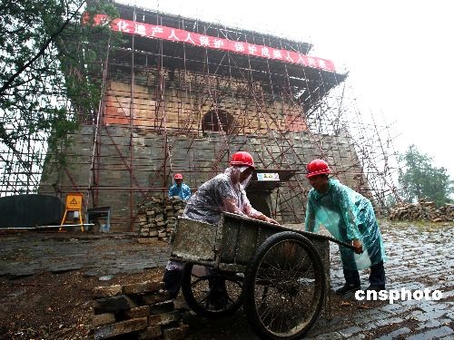 7月17日,已经有五百年历史的明十三陵茂陵启动历史上规模最大的修缮,工程投资1200多万元,预计明年完工。据悉,经过多年的风雨侵蚀,明茂陵已残破不堪,其主要建筑之一的明楼更是破损严重。此次大修将对陵门、陵墙、明楼等重点部分进行修缮,并本着修旧如旧的原则,按照历史资料恢复其原貌,不过修缮仅针对地上部分进行,不涉及地下部分。中新社发 富田 摄