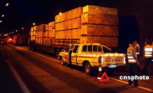 7月18日凌晨4时许,深海高速福建福鼎往宁德方向马头岗隧道内发生一起两车追尾交通事故,造成一人死亡、四人受伤。图为皮卡车追尾撞上一辆大型货车,车头严重变形。中新社发 陈强 摄