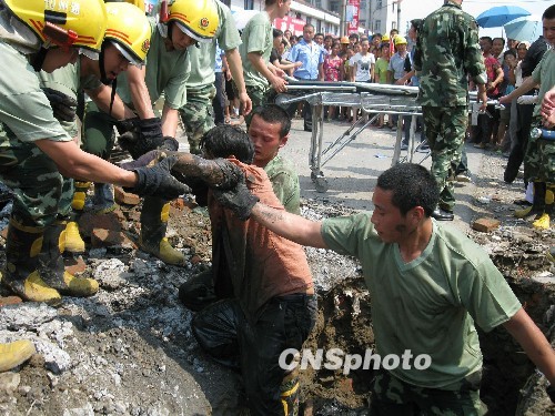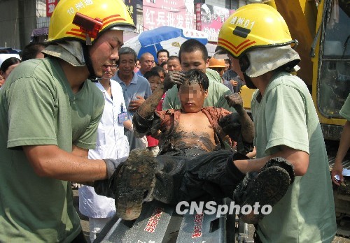 7月17日中午,江苏通州市川港农贸市场门前,一男子爬入下水管道内被困其中。12点20分,通州消防中队官兵赶赴现场,然而由于下水道洞口狭小,且里面光线较差,被困人员情况无法得知,经仔细勘查,救援人员发现前方有一下水道洞口与之相通,营救行动迅速展开。经过两个多小时的营救,被困人员被成功救出并送往医院救治。中新社发 裘明明 摄