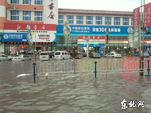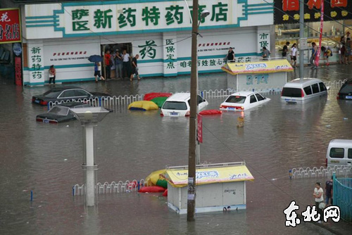 15点50分左右,大庆下起了大雨,大雨持续了二个多小时,在大庆市萨而图区会战大街,积水已经漫到了人行道中间,车辆只能在水中缓步前行。
