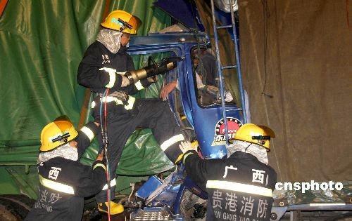 7月20日凌晨2时23分,广西南梧高速公路贵港路段两辆满载物品的大货车追尾相撞,导致后车驾驶室位置被严重挤压变型,3人当场死亡。图为贵港消防支队特勤大队在现场救援。中新社发 杨文福 摄