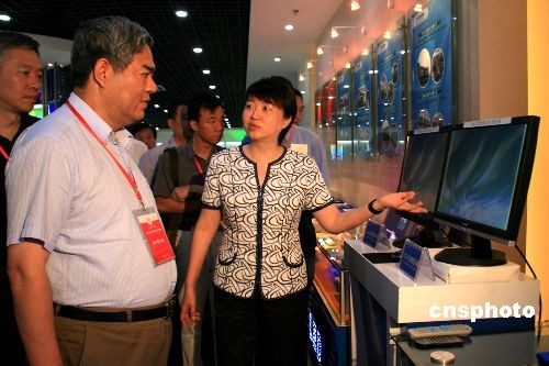 7月20日上午,在扬州市长王燕文(右一)陪同下,由南京大学党委书记洪银兴(左一)率领的南京大学苏中经济社会发展考察团一行参观扬州“新能源、新光源、新材料” 展示大厅。目前,扬州新能源、新光源产业已集聚一批龙头企业,形成较为完整的产业链,到2012年太阳能光伏产业和半导体显示终端产业产值将达到“双千亿”目标。新能源、新光源、新材料“三新”产业产值今年1—4月增长39%,高于全市平均增幅近18个百分点。中新社发 崔佳明 摄