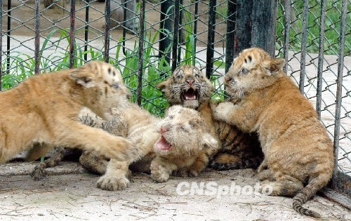 7月20日,在济南野生动物世界,刚出生2个月的四胞胎小老虎首次走出产房与游客见面。据了解,该景区饲养的孟加拉虎“虎妞”于5月10日产下四胞胎,其中两只是金虎,一只雪虎,一只孟加拉虎,专家介绍,一胎产下3个品种的虎崽,在国内还是首次出现。另据了解,虎有3种基因的颜色,黑色、黄色和白色,其中黑色与黄色是显性基因,白色为隐性基因,当黄色基因不能表达时,被白色基因掩盖,就生出白虎,黑色与黄色基因都没有表达时,白色基因就成为显性基因,就生出雪虎,当白色与黑色基因变成隐性基因时,就会生出金黄色的虎,也称为“金虎”。中新社发 龚辉 摄