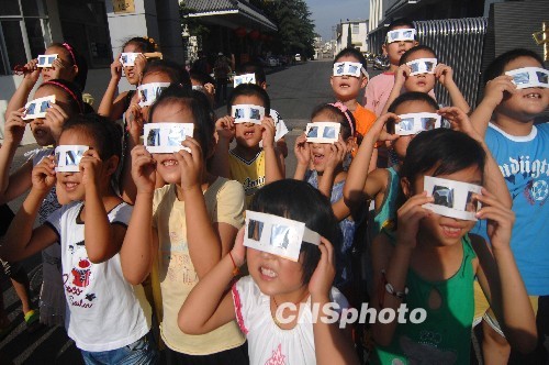 7月20日,江苏省扬州市广储社区举行模拟“追日”活动。来自社区的30多名小朋友,在扬州大学文学院大学生志愿者的指导下,学习制作简易日食观测镜,提前体验观看日全食“景象”。中新社发 陈中秋 摄