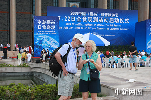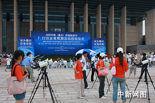 7月22日,天文爱好者和市民在浙江嘉兴七一广场准备观测日全食。汪恩民 摄