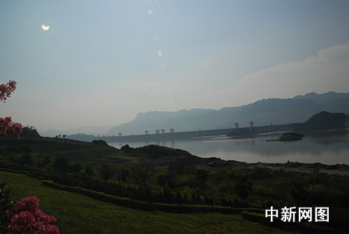上午9时左右,三峡大坝、副坝为应对日全食,点亮了灯光信号。郭晓莹 摄