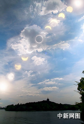 中新网杭州7月22日电(记者 张兆岭)二十二日早八时二十二分左右,世人瞩目五百年一遇的日全食在浙江省杭州市上空出现初亏,由于当地多云,众多市民和游客在著名景点西湖边露眼观测,忽隐忽现的太阳随云层涌动,似穿越时空,给这个天象奇观更添几分神秘;九时三十四分,日甚,全城进入夜间模式,惊呼声、感叹声、喝彩声……让西湖进入一次白天的夜间狂欢。至十点五十五分太阳整体重放光芒,众多观者依然不愿离去。