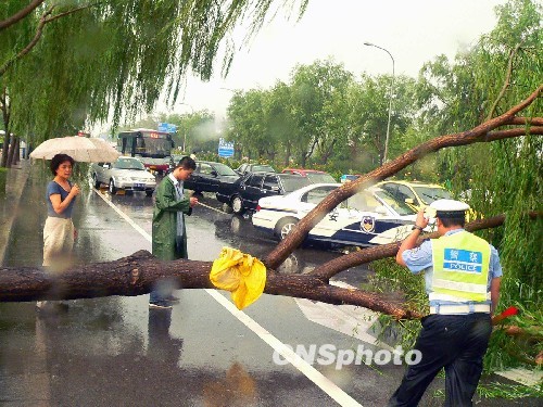 7月22日17时许,北京突降大雨,狂风暴雨中还夹着黄豆大的冰雹。位于北京市朝阳区平房桥西侧,由东向西方向行驶路段路边的一株柳树,被骤然间刮起的一阵大风连根拔起,造成交通短时中断。在交警部门的指挥下,二十余位市民齐心协力,将柳树移开。中新社发 李佳明 摄